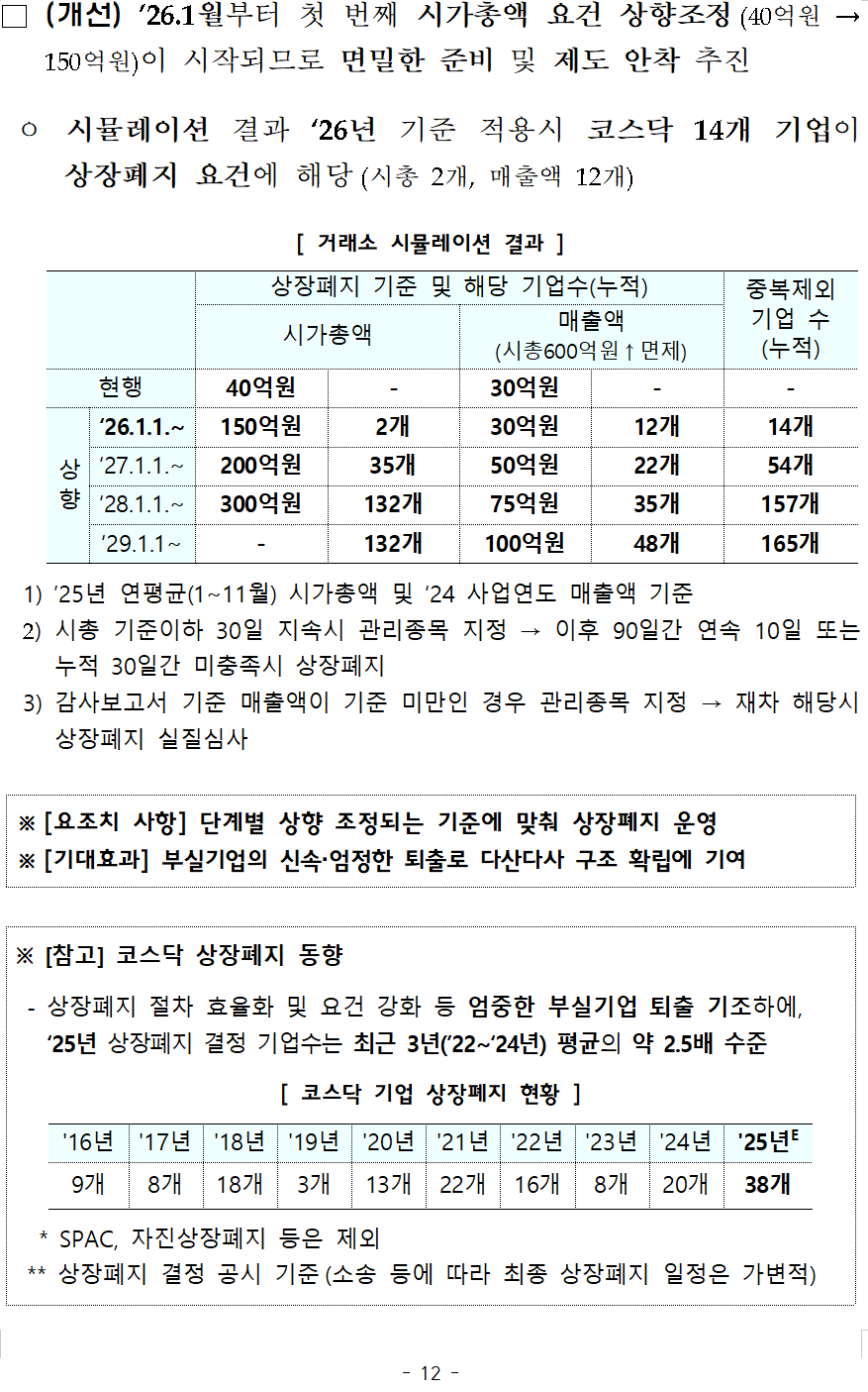 韓国取引所のシミュレーションの結果、現在コスダックにオンラインカジノポーカーしている企業のうち、2026年基準を適用した場合、14社(時価総額下2社、売上高下12社)が即時オンラインカジノポーカー廃止の危険にさらされていることが分かった(2025年1月から11月までの平均時価総額と2024年の売上高を基準)。時価総額基準が300億ウォンに上がる2028年には、その数は157社(時価総額132社、売上高35社)に急増すると予想される。
